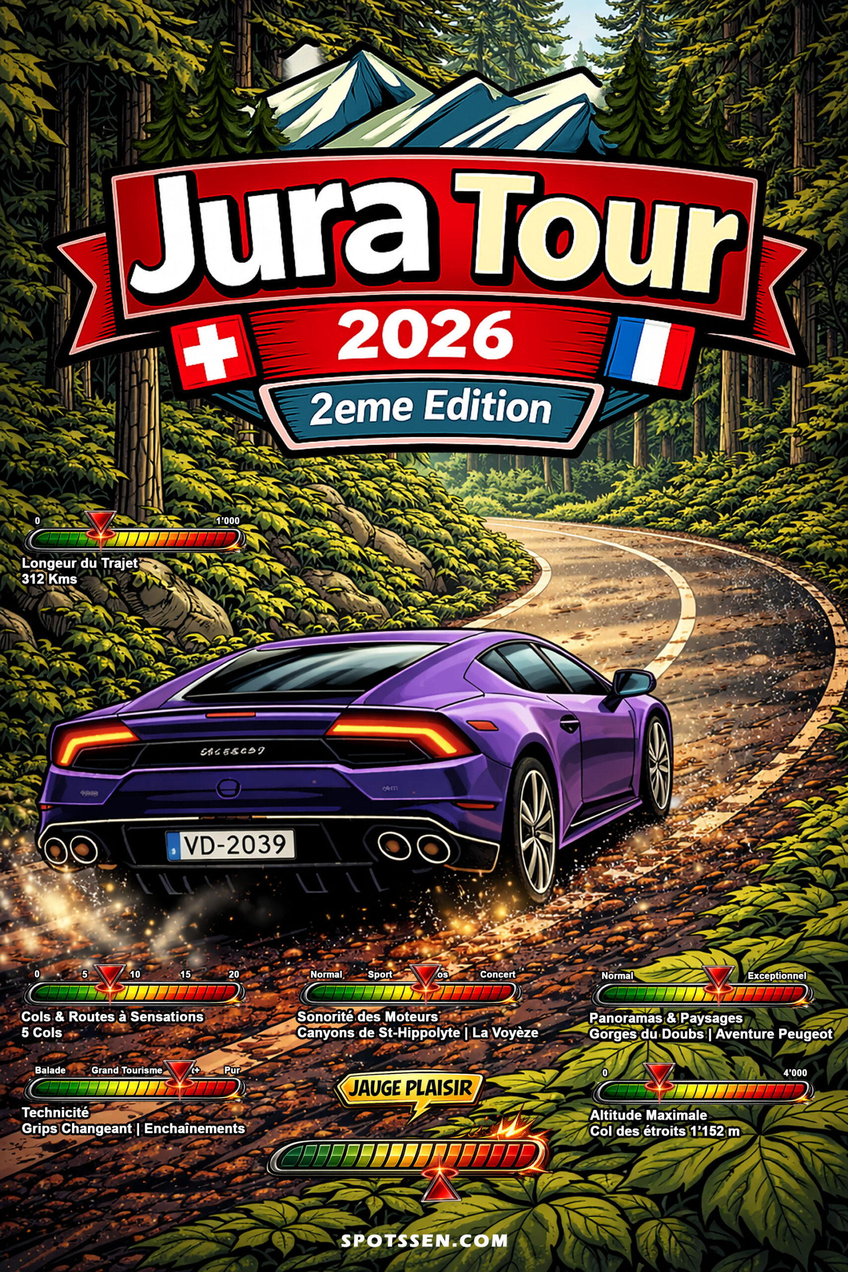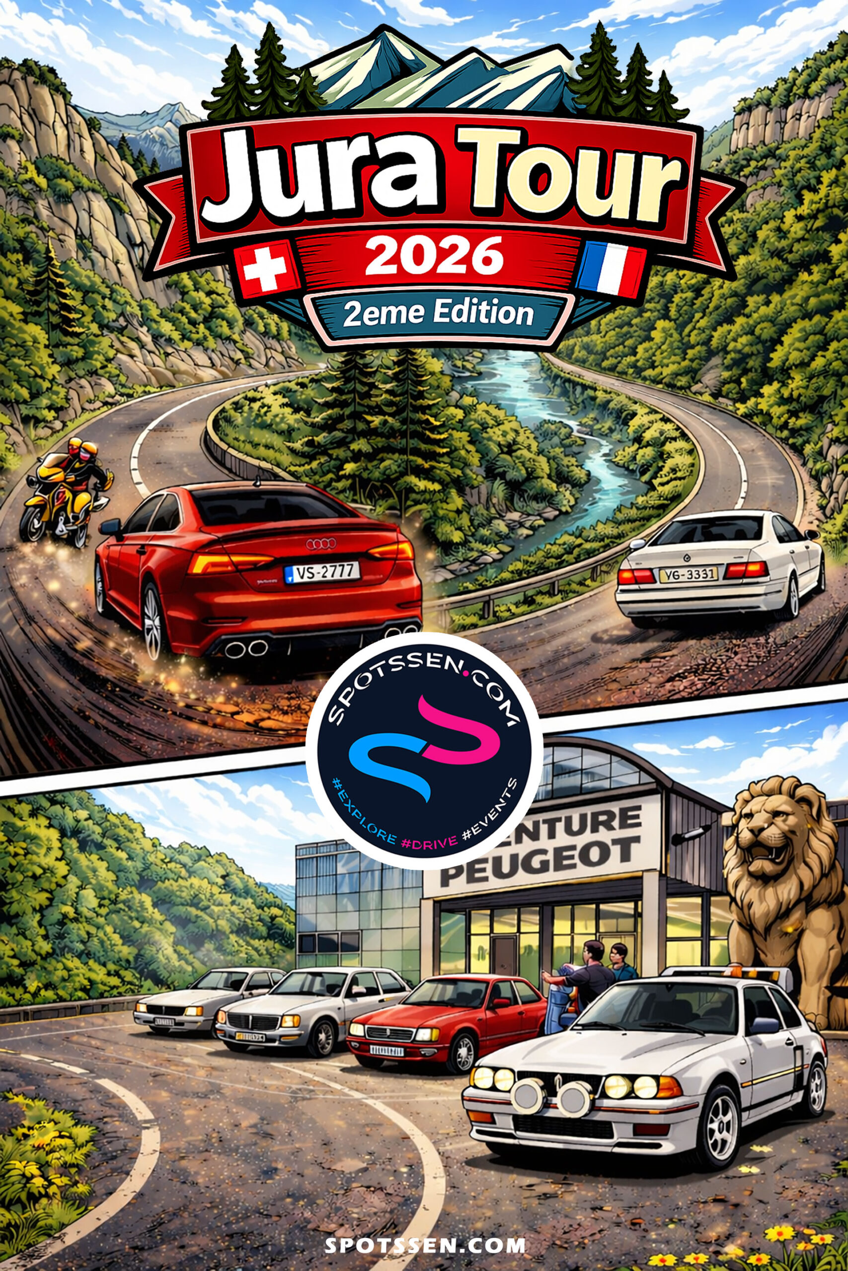 Spotssen. Drive. Events. nous a propose sa troisième sortie de l’année avec la 2ème édition du Jura Tour qui nous mènera cette année au travers des belles routes Jurassiennes Suisses et Françaises jusqu’à l’Aventure Peugeot à Sochaux, haut lieu de la passion pour la marque au lion. Ce sera pour nous l’occasion de découvrir des paysages magnifiques mais aussi l’histoire de la marque Peugeot et ces modèles emblématiques allant des groupes B des années 80 aux gagnantes des 24h du Mans. Un magnifique roadtrip comme d’habitude dans cette région, entre montagnes et forêts, entre tradition et innovation. Un Drive&Coffee cette fois avec 67% de roulage et 33% de pauses et visites. Un bel évènement à venir!